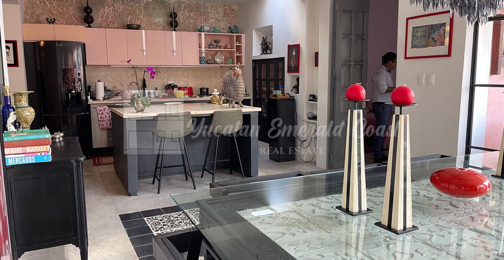 Beautiful renovated residence for sale in Barrio de Santiago. Nearby you will find Santa Ana park, Paseo Montejo and the famous gastronmic corridor or the 47th street. The property is a one storey house fully restored. The residence has a beautiful art déco facade with a fine eclectic interior design. This chic home has indoor parking for 1 car, a porche, a living room, an open kitchen, a dining room a laundry room , one bedroom with full bathroom, a master bedroom with walk in closet and full bathroom and a spacious terrace with a pool that has a filter and a heating system. The property includes: All home mechanicals, a cistern, 4 air conditioners, high water pressure, filter and heating system for the pool. The house is sold fully furnished as shown on the pictures.
